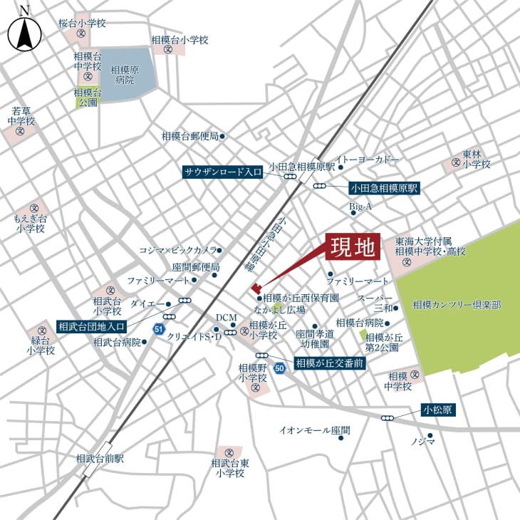 『コモンステージ小田急相模原』は、小田急小田原線「小田急相模原」駅(約850~920m)まで徒歩11~12分の分譲地です。