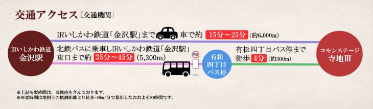 ●「有松四丁目」徒歩4分(300m)で北鉄バス乗車し金沢駅東口まで約35分~45分