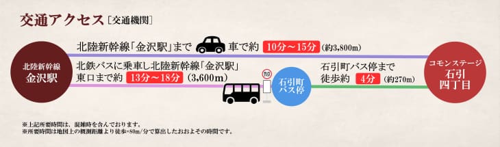 ●北鉄バス「石引町」バス停徒歩約4分(270m)から乗車し金沢駅東口まで13分~18分(約3,600m)