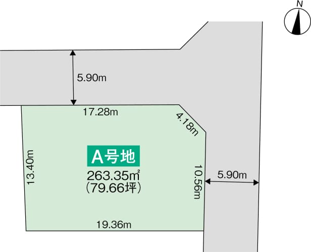 79坪超の北東角地。前面道路の幅員は約5.9mあり、お車の入出庫をスムーズに行えそうです。