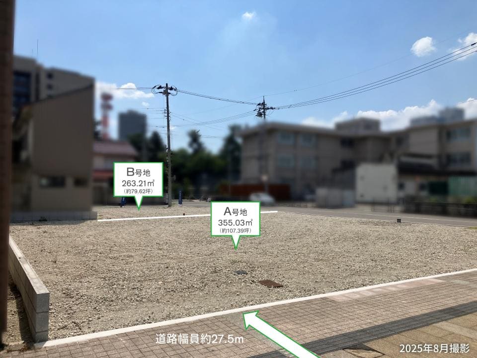 【コモンステージ福井市大手Ⅱ】様々なプランに対応可能な角地、2区画を分譲中。小学校へ徒歩2分、子育て世帯にもおすすめのロケーションです。/2025年8月撮影