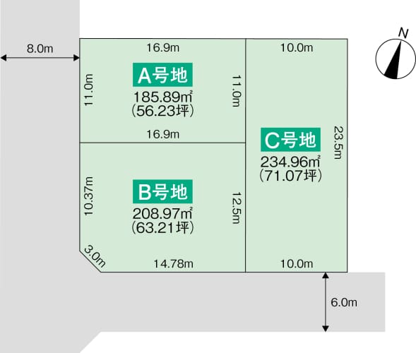 角地や整形地など、それぞれ魅力のある3区画を分譲中。