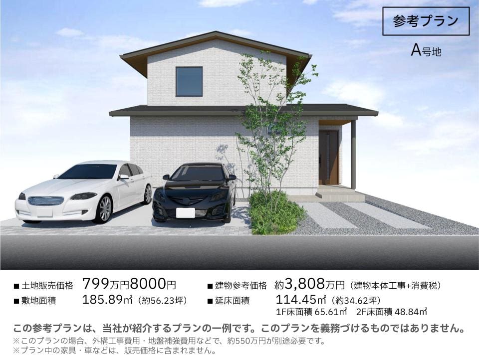 土地価格/799万8000円、敷地面積/185.89㎡(約56.23坪)。床面積/1階65.61㎡、2階48.84㎡、延床面積/114.45㎡(約34.62坪)。