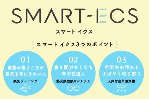 「化学物質の抑制」と「換気・空気清浄」の2つの取り組みにより、快適な空気環境を実現する「エアキス」。影響を受けやすい子どもを基準に化学物質をできるだけ発生させない建材や接着剤を使用。また熱交換と外気清浄機能を備えた「アメニティー換気システムⅣ」を用意。5つの化学物質について厚生労働省指針値の1/2以下を目指しています。