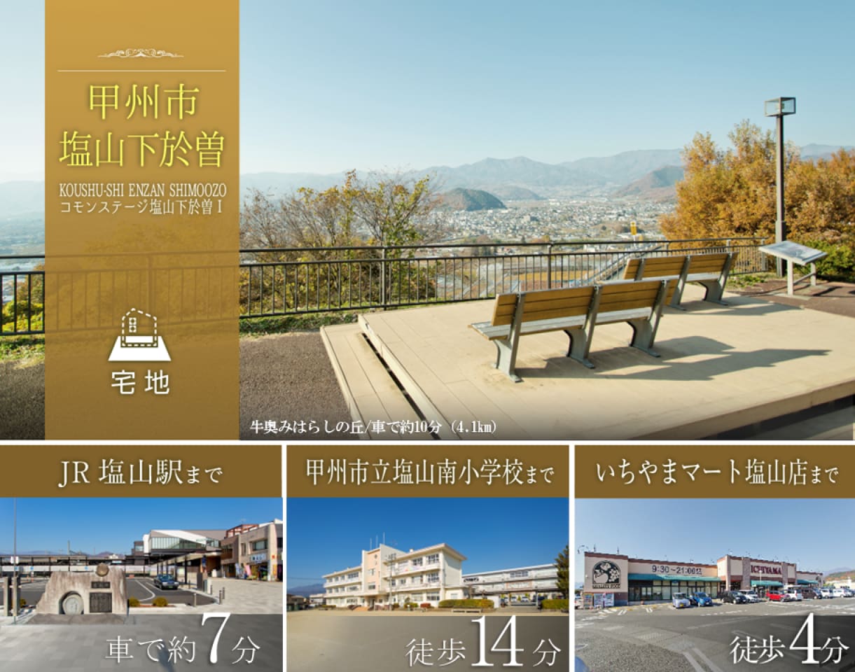 いちやまマート塩山店まで徒歩4分(300~310m)、塩山南小学校まで徒歩14分(1040~1050m)、塩山市民病院まで徒12分(920m~930m)、生活に欠かせない施設やお店が近くて暮らしやすい住宅地です。