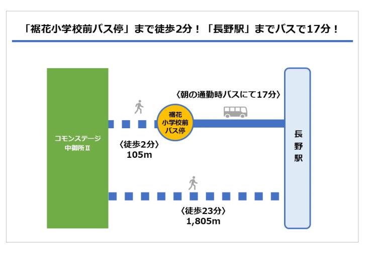 分譲地から長野ひまわり幼稚園まで徒歩9分、裾花小学校まで徒歩3分、裾花中学校まで徒歩8分です。