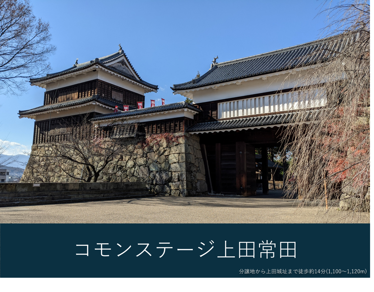 分譲地より東小学校まで徒歩8~9分、ツルヤ上田中央店まで徒歩6分、上田駅まで徒歩11~12分です。