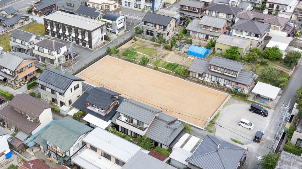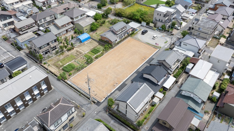 分譲地周辺は一戸建てが多い閑静な住宅街です。高い建物が少なく、日差しを取り込んだ開放的な住まいづくりが可能です。/航空写真(2025年6月撮影)