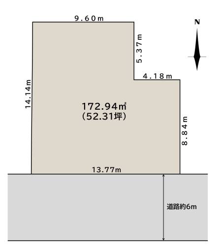 葵小学校へ徒歩9分。南道路で間口13.77mの52.31坪、1区画。
