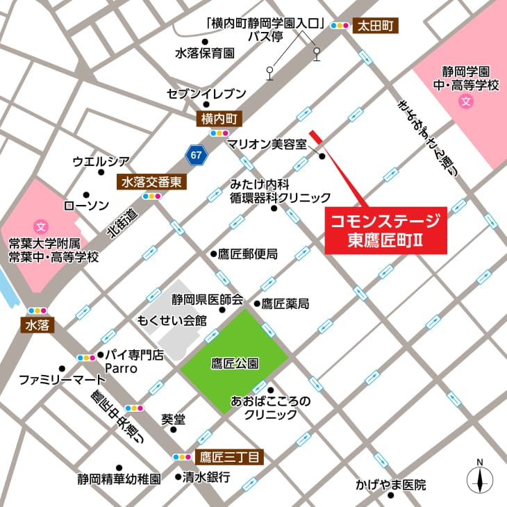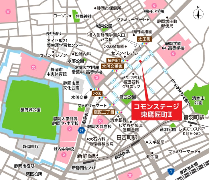 東鷹匠町の南道路33.22坪、1区画。静鉄「新静岡」駅まで徒歩12分。静岡市中心地の利便性の良い整形地。