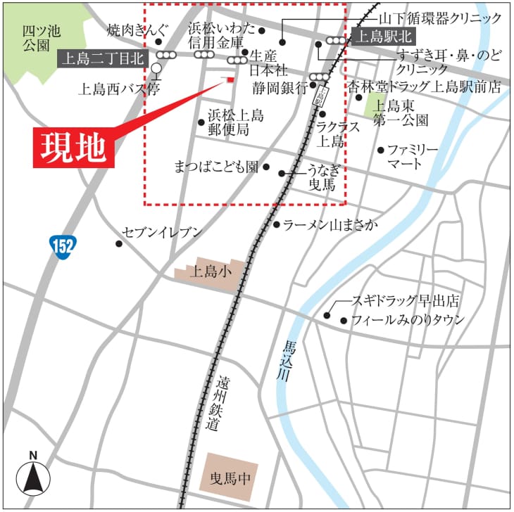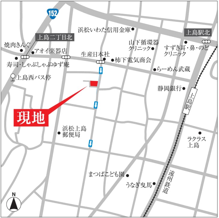 現地から400m~420m。 徒歩5分~6分。遠州鉄道上島駅