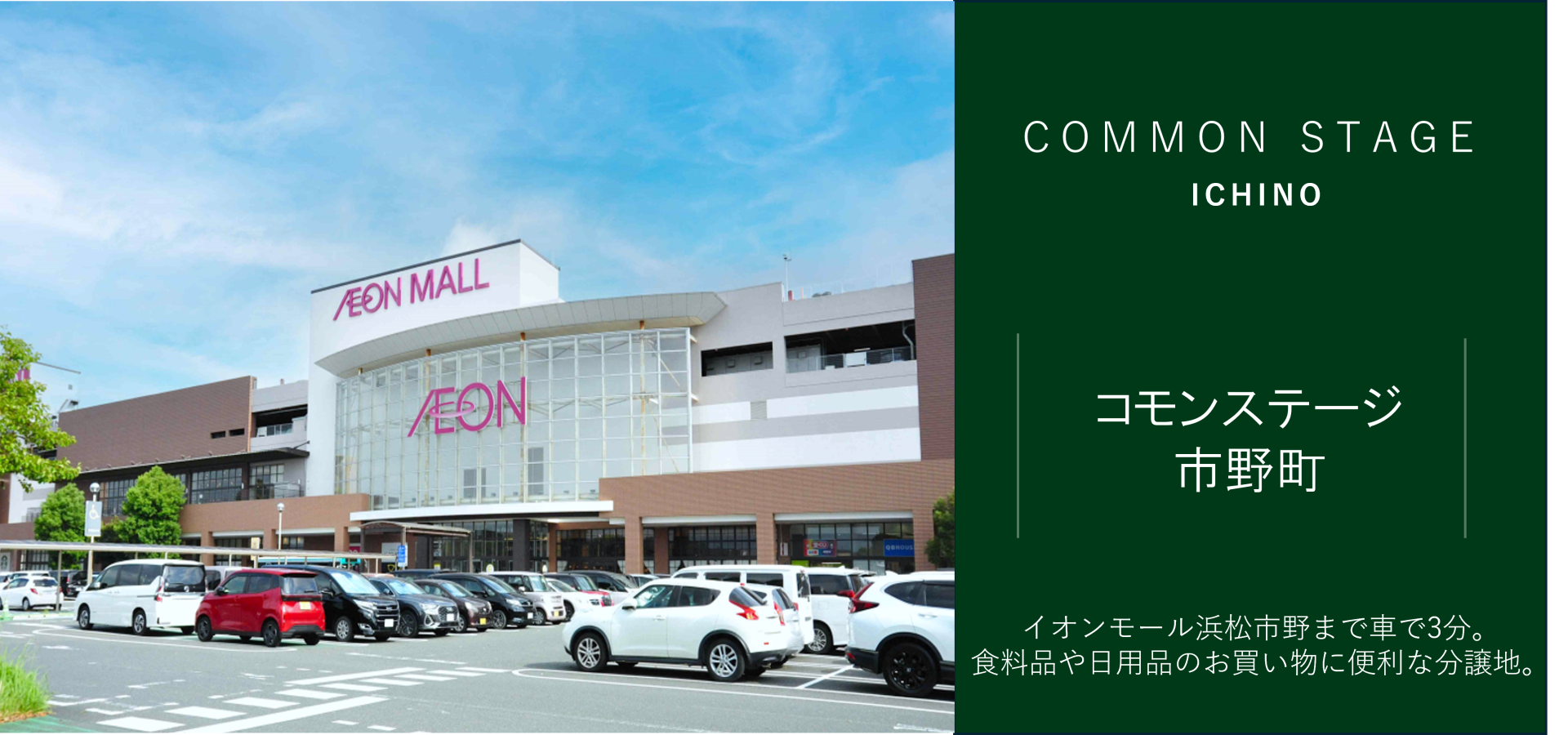 イオンモール浜松市野まで車で3分、コストコ浜松倉庫店まで車で9分と食料品や日用品のお買い物に便利な分譲地です。