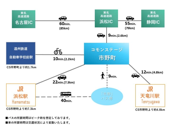 イオンモール浜松市野。現地から1200m~1230m。