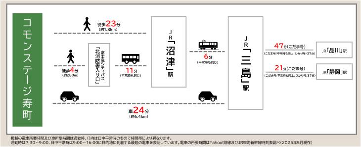 沼津駅から東海道本線で三島駅まで乗車約6分です。新幹線に乗り換え、品川駅まで乗車47分。首都圏への通勤・通学にもおすすめです(いずれも通勤時)。