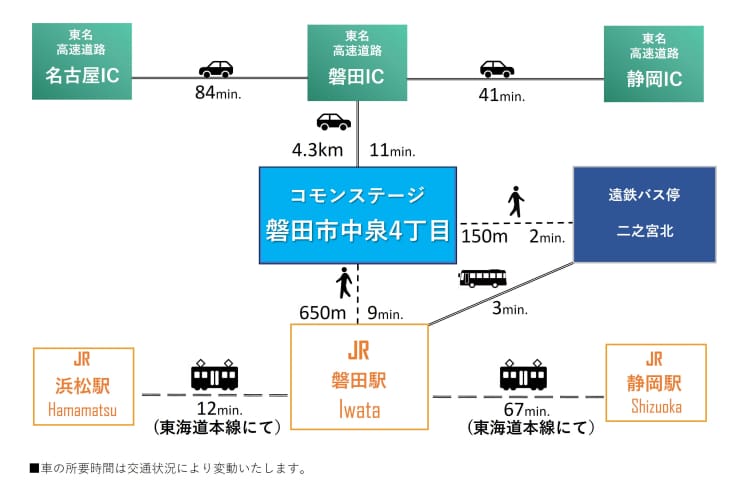 浜松へ12分、静岡へ67分(JR東海道本線にて)。