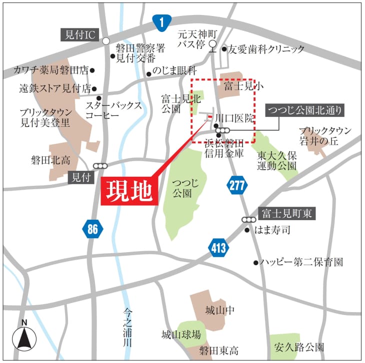磐田バイパス見付インターまで約1.8キロにあり、交通アクセスの良い場所です。