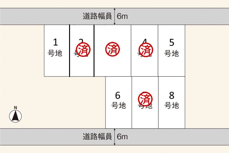 50坪超の全8区画、南及び北側前面道路は幅員約6.0mです。