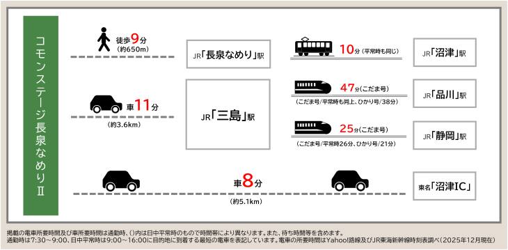 JR長泉なめり駅まで徒歩9分です。JR三島駅から東海道新幹線を利用してJR品川駅まで47分です。