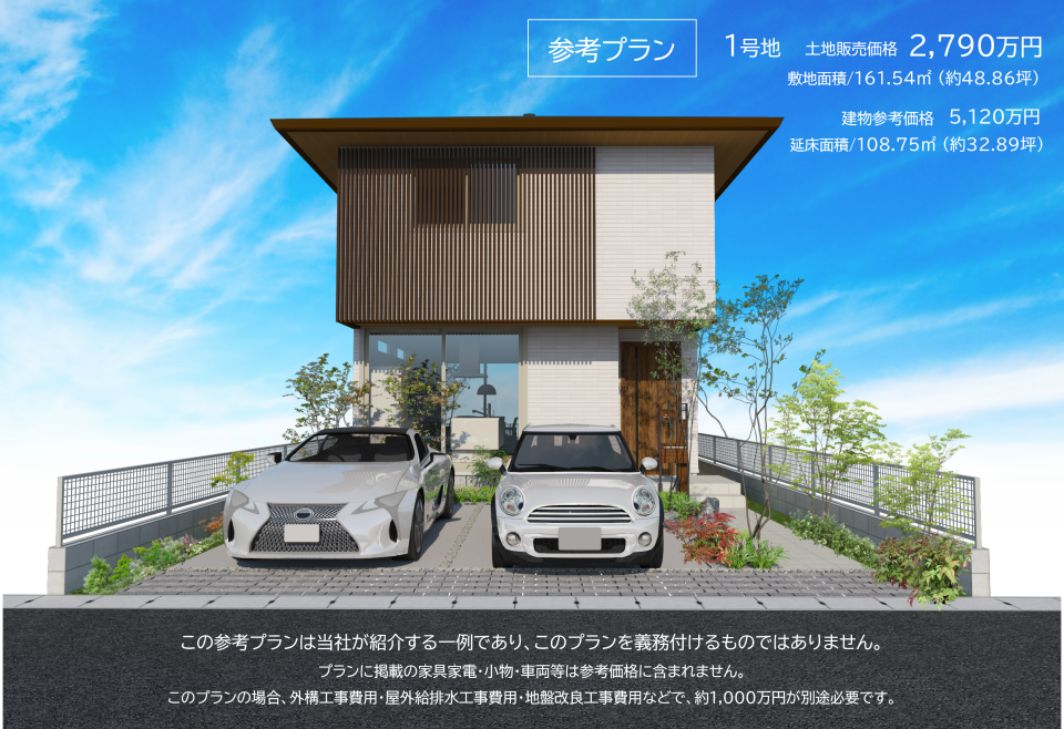 建物参考価格(建物本体価格+消費税)5,120万円(このプランの場合、外構工事費用・屋外給排水工事費用・地盤改良工事費用などで約1,000万円が別途必要です)