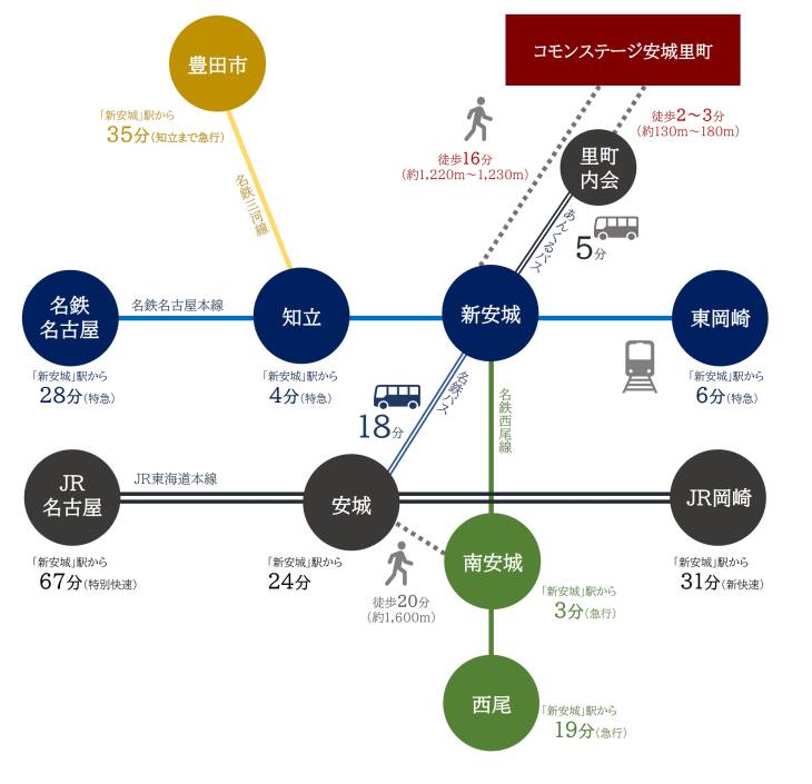 特急停車駅である名鉄名古屋本線「新安城」駅まで約1.2km、伊勢湾岸自動車道「豊田南」IC まで約4.6km、