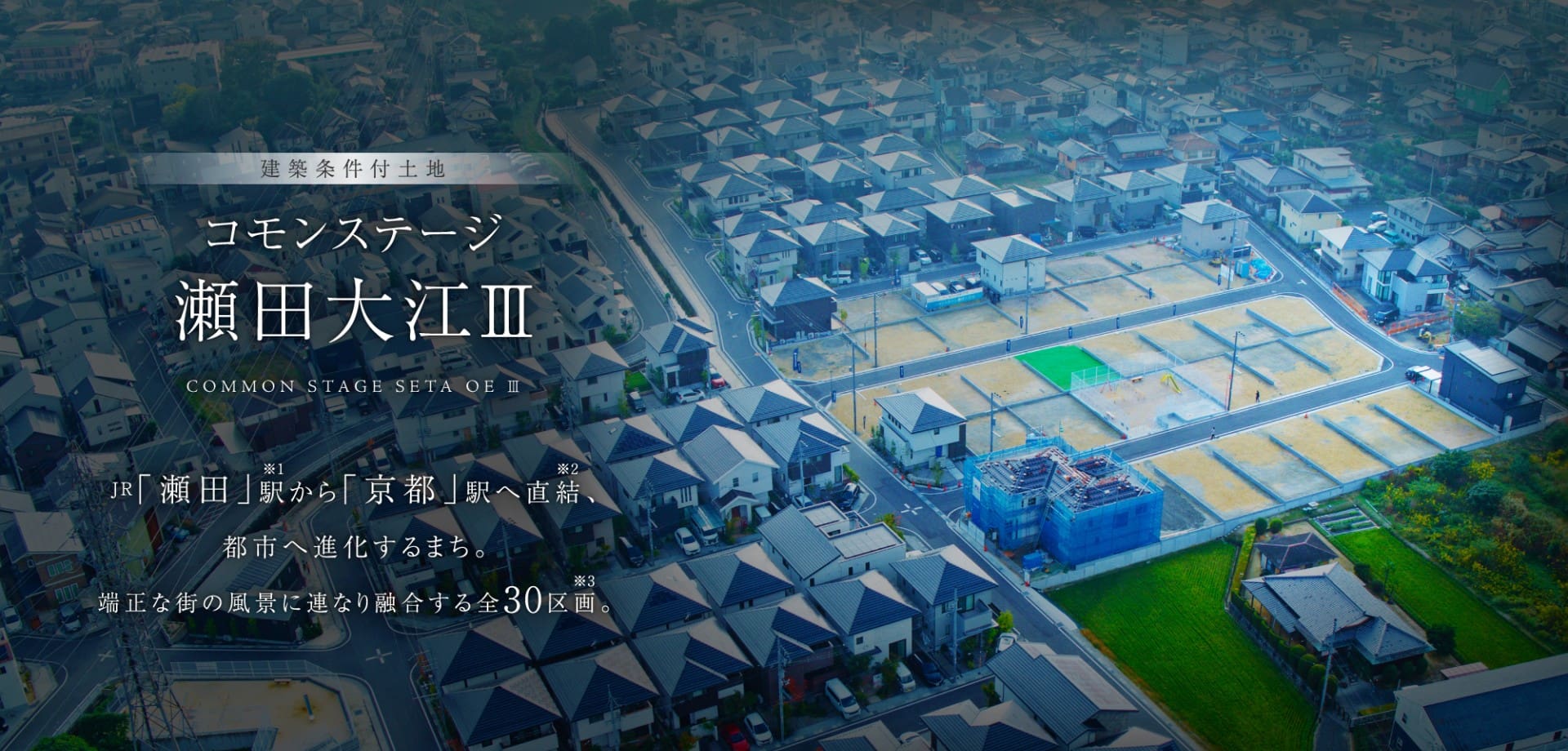 大型分譲地「コモンステージ瀬田大江Ⅲ」(当社販売区画数28区画)。住まう方の暮らしに寄り添うプランニングで、快適に過ごせる住まいをご提案いたします。/2024年11月撮影