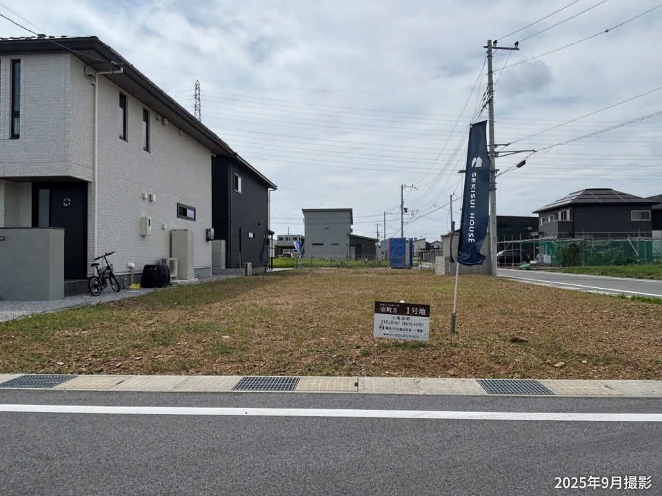 1号地は開放的な角地につき、カースペースや玄関位置など、間取りの選択肢が広がります。前面道路の幅員は約6mあり見通しが良いため、お車の運転も快適です。/2025年9月撮影