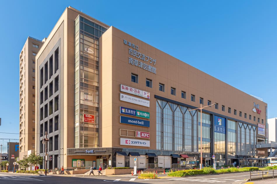 - フェリエ南草津まで徒歩13分(約1040m)。ドラッグストアや衣料品店、100円ショップ、書店などの他、学習塾、英会話教室、フィットネス、市立図書館など、近くにあると嬉しい施設が入っています。「南草津」駅直結のため、お仕事帰りやお出かけのついでに気軽に利用できます。