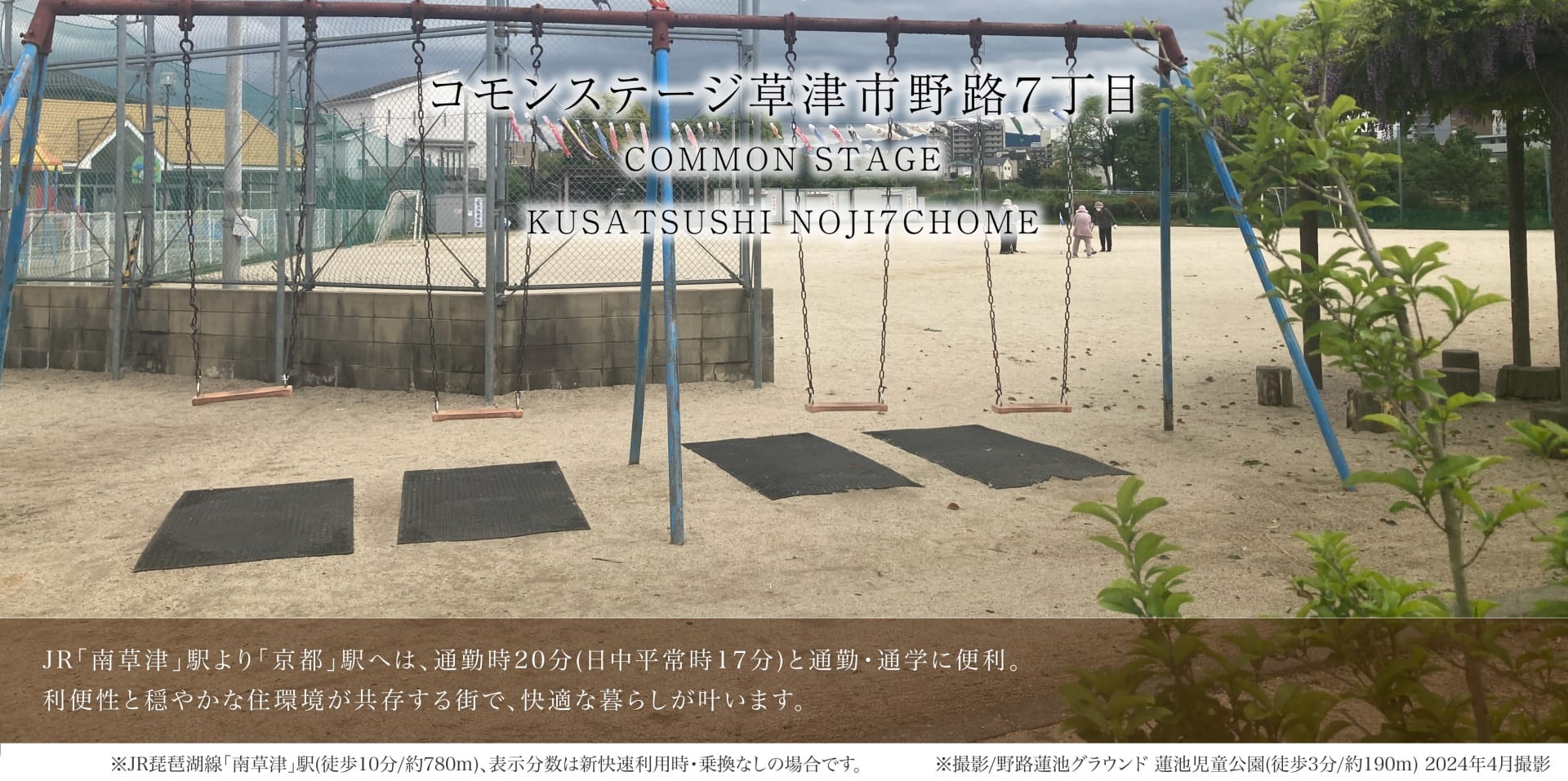 JR琵琶湖線「南草津」駅から「京都」駅へ通勤時直通20分(日中平常時17分)、「大阪」駅へ通勤時直通52分(日中平常時47分)。