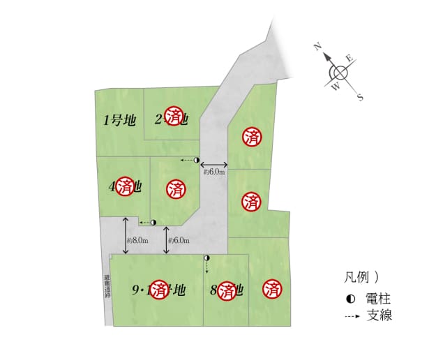 58坪超の敷地を分譲中。分譲地内道路は幅員6m以上を確保し、カーライフも快適です。