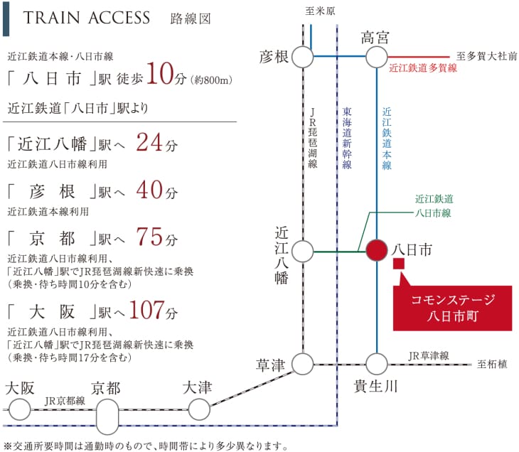 「彦根」駅へ乗車40分、「京都」駅へ乗車75分。主要部へアクセスしやすく、毎日の通勤・通学をサポートします。