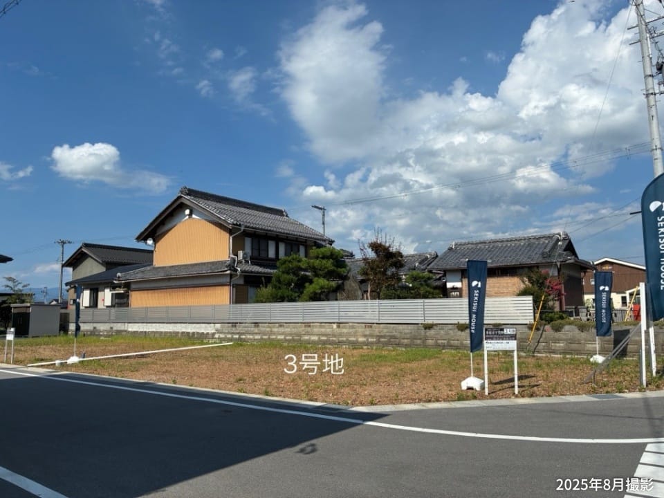 【3号地】南・西側が接道する、開放感のある角地です。2方向に開けた心地よい空間で、家族団欒の時間をお楽しみいただけそうです。/2025年8月撮影