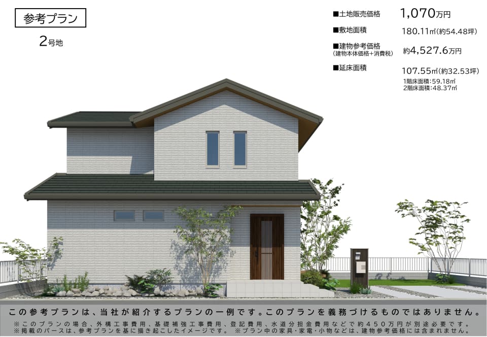 土地価格/1070万円、敷地面積/180.11㎡(約54.48坪)。1階床面積/59.18㎡、2階床面積/48.37㎡、延床面積/107.55㎡(約32.53坪)。