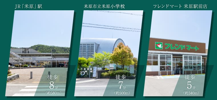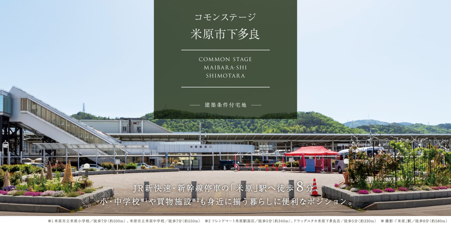 各方面へ快適にアクセスできる、JR「米原」駅へ徒歩8分。買物施設や小中学校が徒歩7分圏内に揃う、ご家族の皆様が暮らしやすい住環境です。