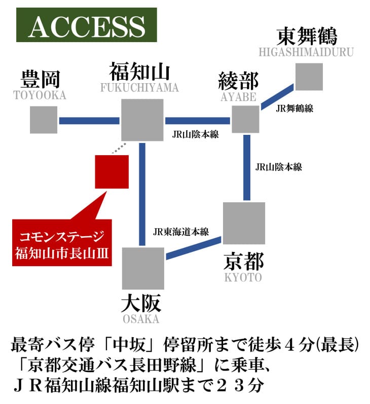 「中坂」停留所まで徒歩4分。3路線が乗り入れるJR「福知山」駅へ乗車23分でアクセス。
