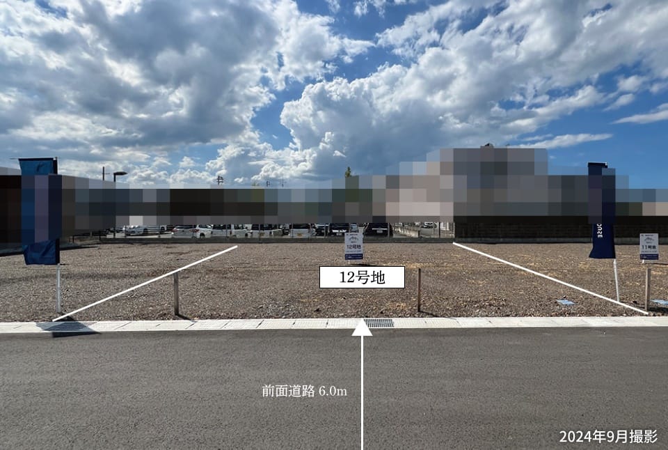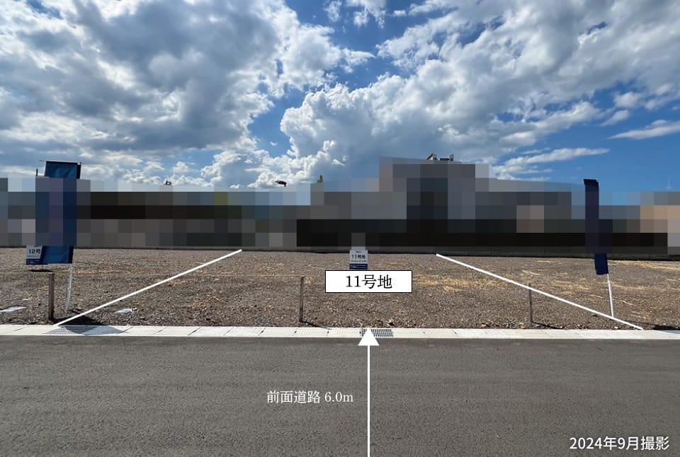 【11号地】前面道路の幅員は約6.0mあり、車の入出庫をスムーズに行えます。向かいの建物と距離を保つことができ、プライバシーを守りやすいことも嬉しいポイントです。/2024年9月撮影