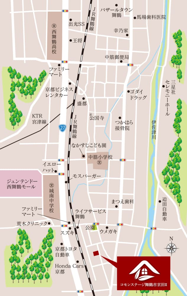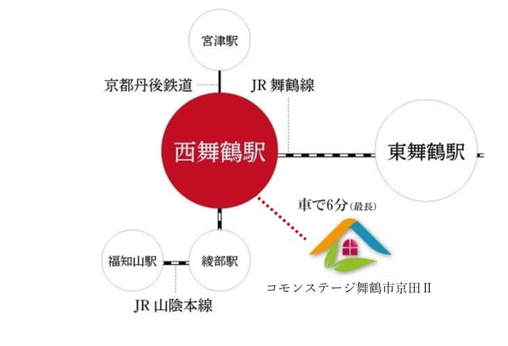 JR舞鶴線と京都丹後鉄道宮舞線が乗り入れる「西舞鶴」駅まで車6分(約2300m)。