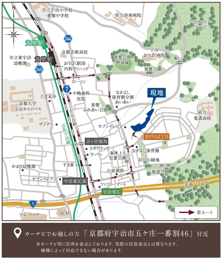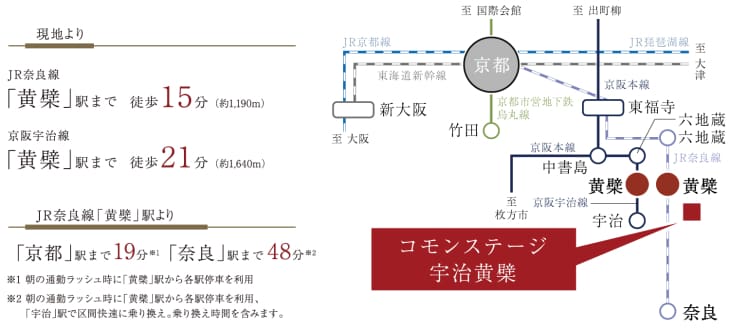 JR奈良線「黄檗」駅へ徒歩15分(約1190m)、京阪宇治線「黄檗」駅へ徒歩21分(約1640m)。