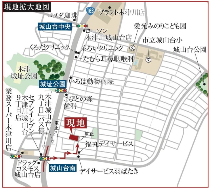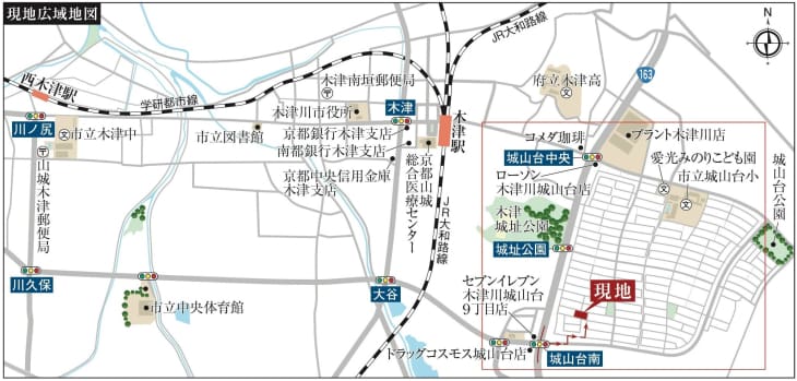 ■JR奈良線「木津」駅まで、徒歩21分、または奈良交通バス「木津城山台九丁目」バス停(内回り)徒歩6分、バス乗車13分