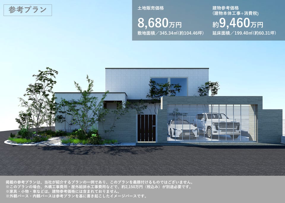 土地価格/8,680万円、敷地面積/345.34㎡(約104.46坪)、延床面積/199.40㎡(約60.31坪)。