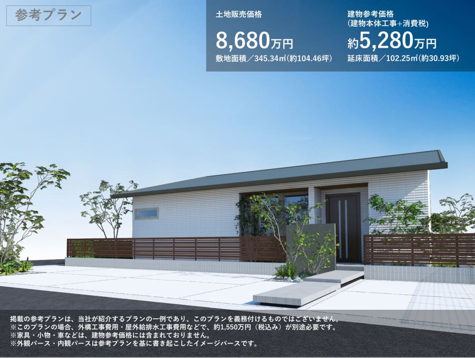 土地価格/8,680万円、敷地面積/345.34㎡(約104.46坪)、延床面積/102.25㎡(約30.93坪)。