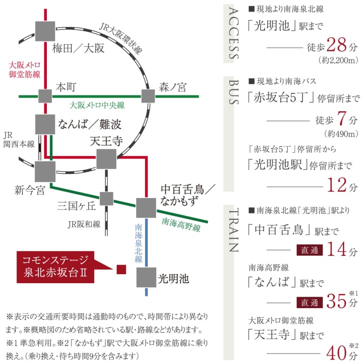 南海泉北線「光明池」駅から「中百舌鳥」駅へ直通14分、南海高野線「なんば」駅へ直通35分でアクセス可能。