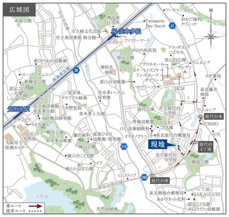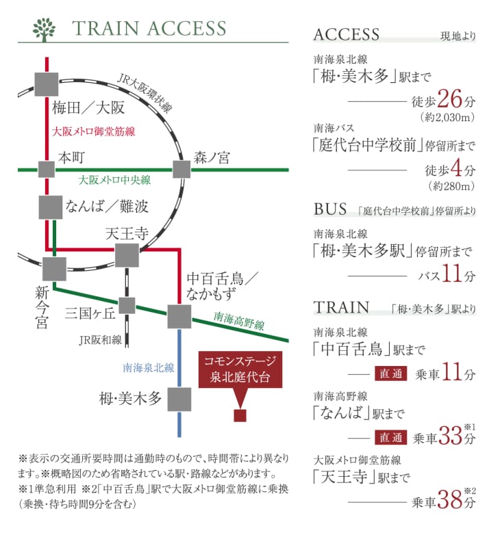 徒歩4分の「庭代台中学校前」停留所から南海泉北線「栂・美木多」駅へ乗車11分。