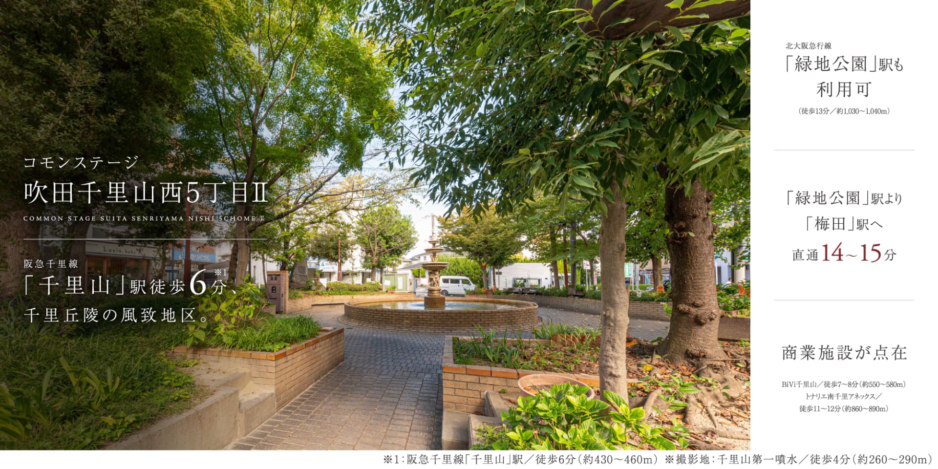 阪急千里線「千里山」駅へ徒歩6分、北大阪急行線「緑地公園」駅へ徒歩13分。2WAYアクセスが可能な立地。