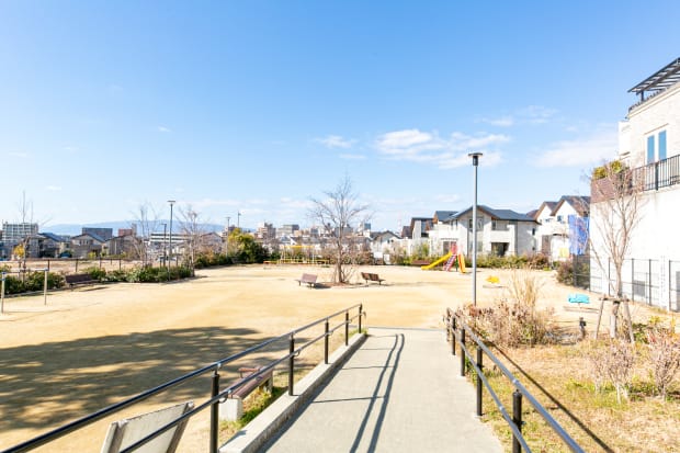 すべり台・鉄棒・ブランコなどの遊具が設置されています。広場もあるので、思いっきり体を動かして遊べます。お子様の見守りや休憩ができるベンチが設けられています。