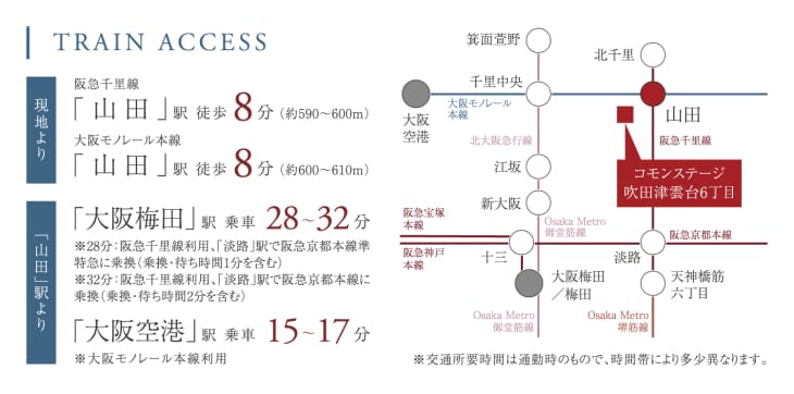 大阪モノレール本線「山田」駅から「大阪空港」駅まで直通15~17分でアクセスできます。