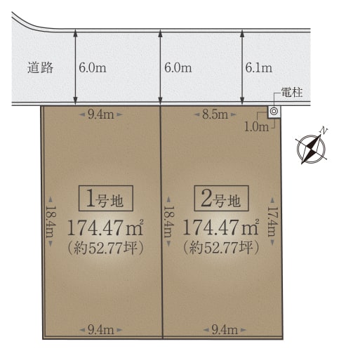52坪超の全2区画。敷地全体を有効活用しやすい整形地です。前面道路は幅員6m以上とゆとりがあり、お車の出し入れがスムーズに行えます。
