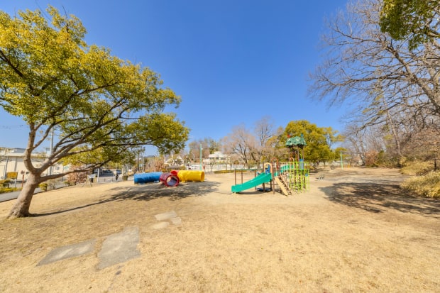 緑が多い自然豊かな公園です。滑り台や雲梯が付いた複合遊具、砂場、ブランコなど、幅広い年代のお子様が楽しめる遊具があります。