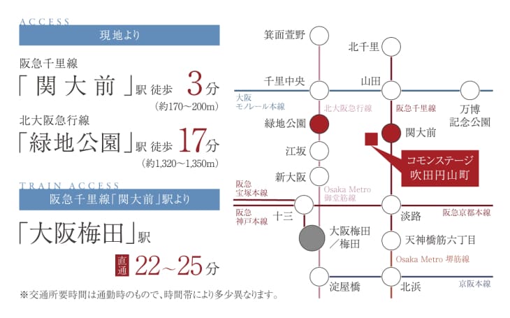 徒歩3分の阪急千里線「関大前」駅から「大阪梅田」駅へ22~25分と、ダイレクトに繋がります。