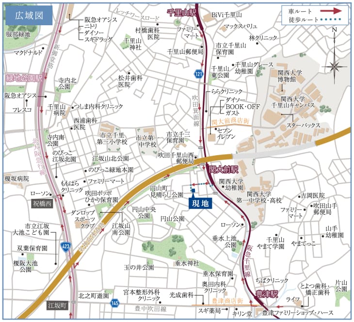 阪急千里線「関大前」駅へ徒歩3分。賑やかな学生街から程よい距離を保つ駅西側、第一種低層住居専用地域内の分譲地です。