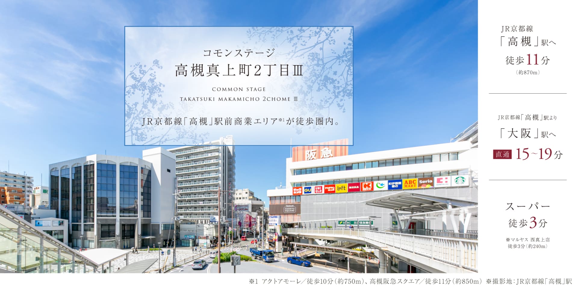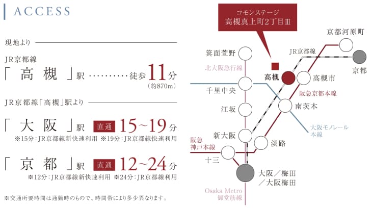 「大阪」駅へ直通15~19分と都心へダイレクトアクセスが叶い、通勤や通学、休日のお出かけがスムーズです。